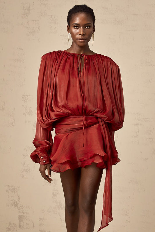• RUFFLED PLEATED LONG SLEEVE MINI DRESS IN RED