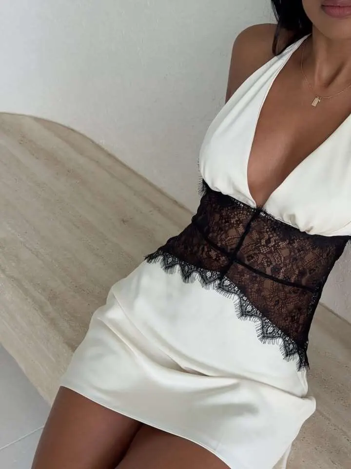 Mabelle Ivory Satin and Lace Halter Mini Dress